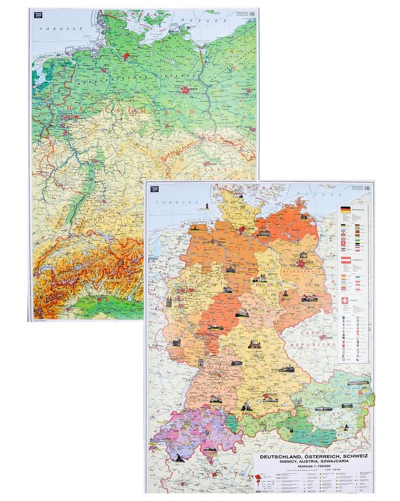 - Niemcy, Austria, Szwajcaria. Mapa ścienna, dwustonna fizyczna .